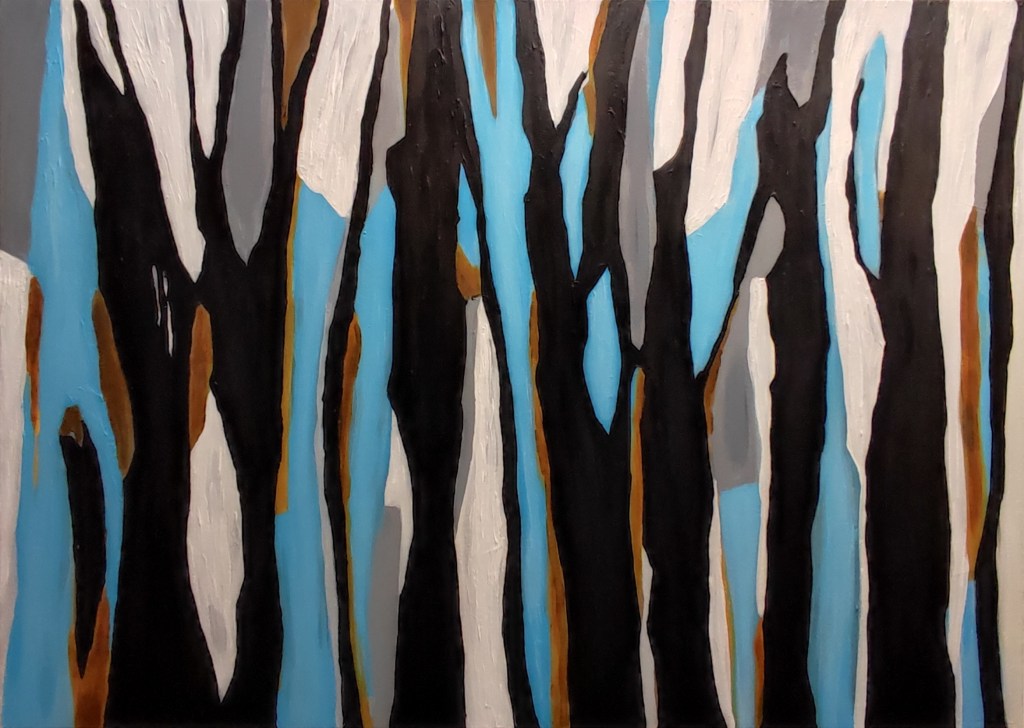 “Kroz gola stabla vidi se nebo”, akril na platnu, 50 x 70 cm, 2023.